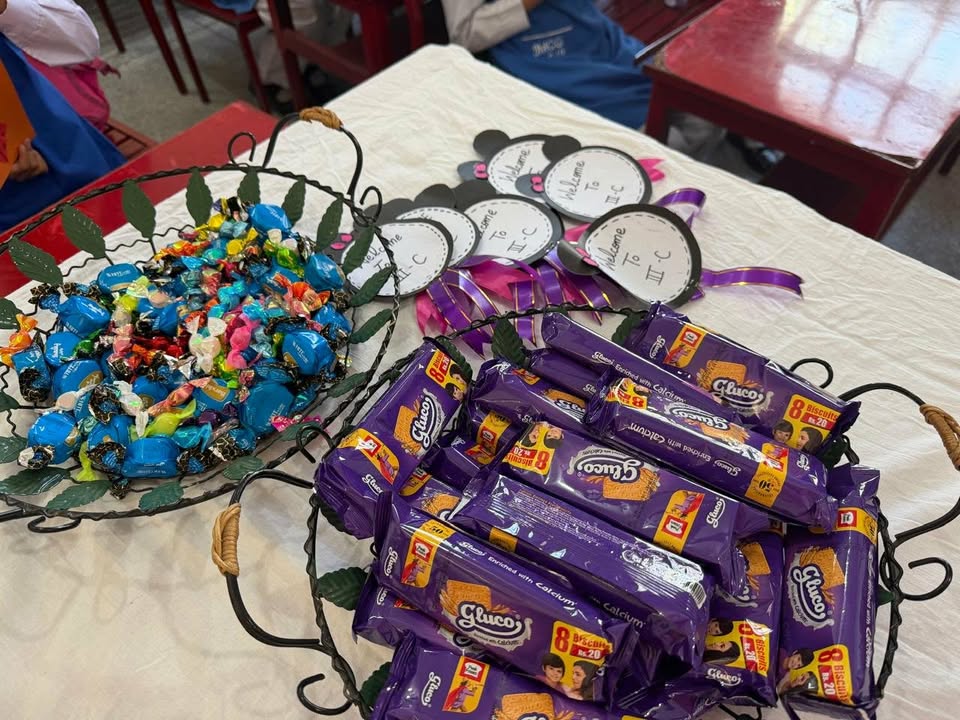 Then, students were shifted to their new classes, where hardworking teachers, having prepared everything with love, welcomed them with sweets, chocolates, balloon decorations, fun games, and badges featuring motivational slogans. 🎈🍫🎮