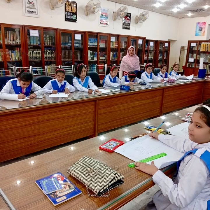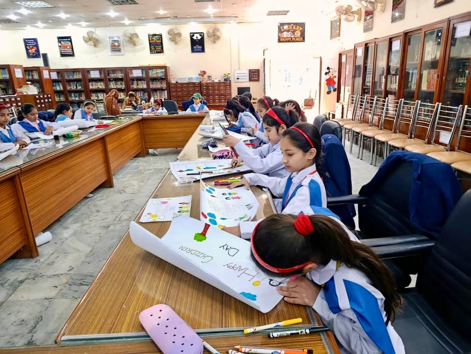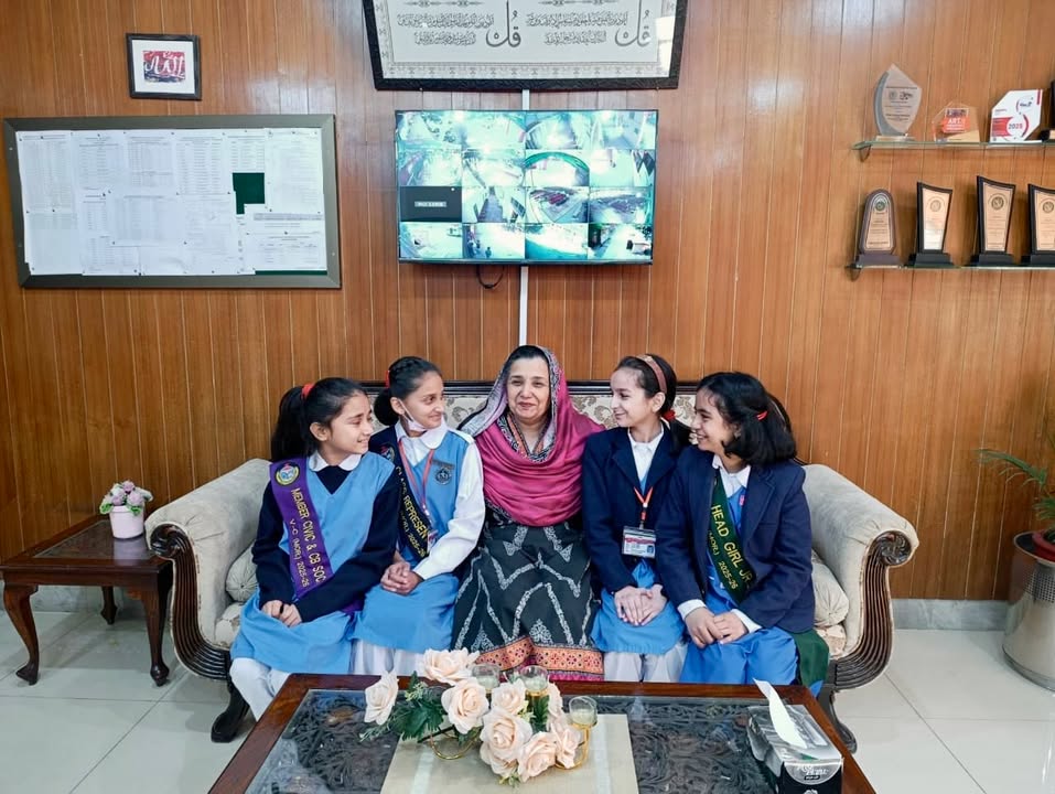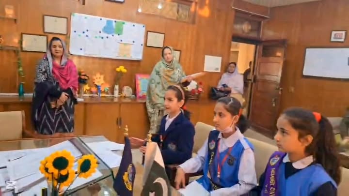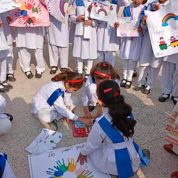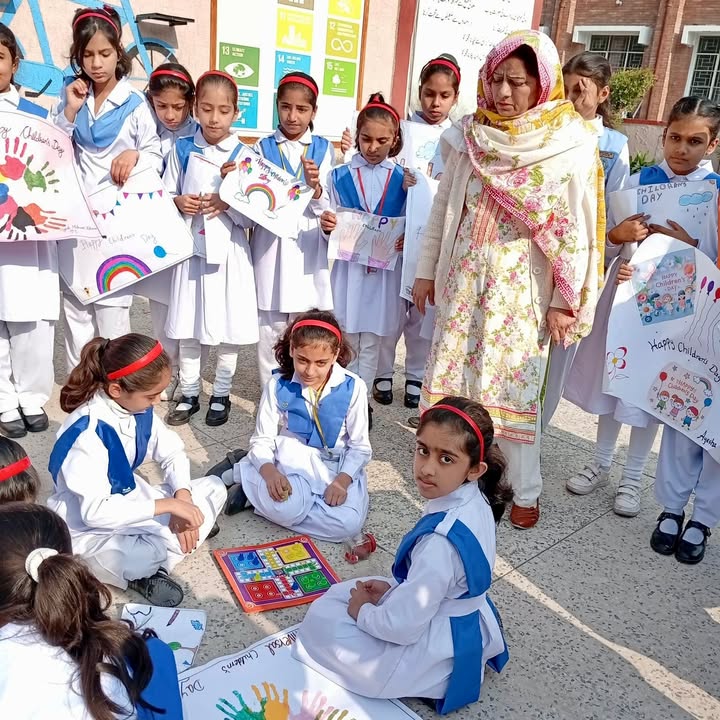 Our Head Girl, Ataaf Naveed proudly took on the role of Principal, while three others Hamna, Fatima Safeer, Yusra Binte Amir, acted as Vice Principals and Head Mistress. They even held a meeting in the Principalโs office to discuss the upcoming exams, showing great responsibility and teamwork.Meanwhile, our Girl Guides created beautiful posters to celebrate Childrenโs Day, showcased their artwork, and posed for a joyful group photo with their teachers, Principal Prof. Aaliya Durrani, both Vice Principals Ms. Asma Maqbool Niazi and Ms. Tasneem Kausar, and Head Mistress Ms. Irum Aziz.