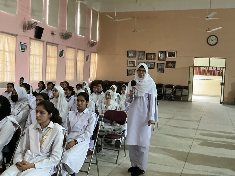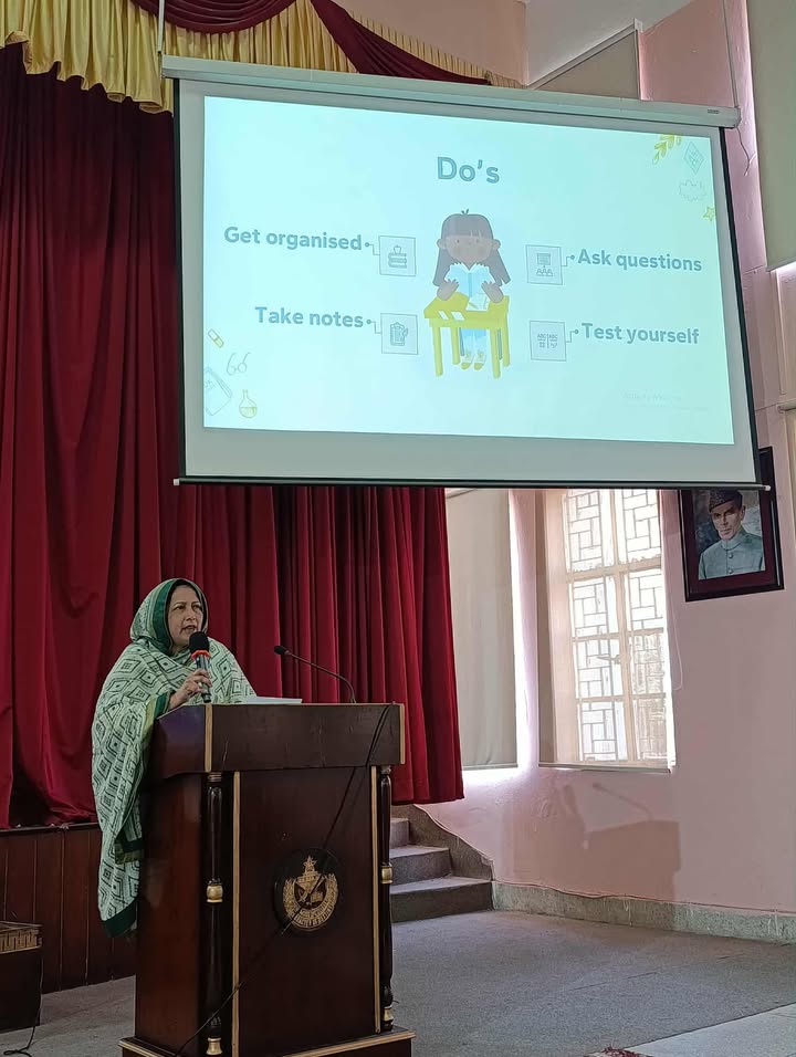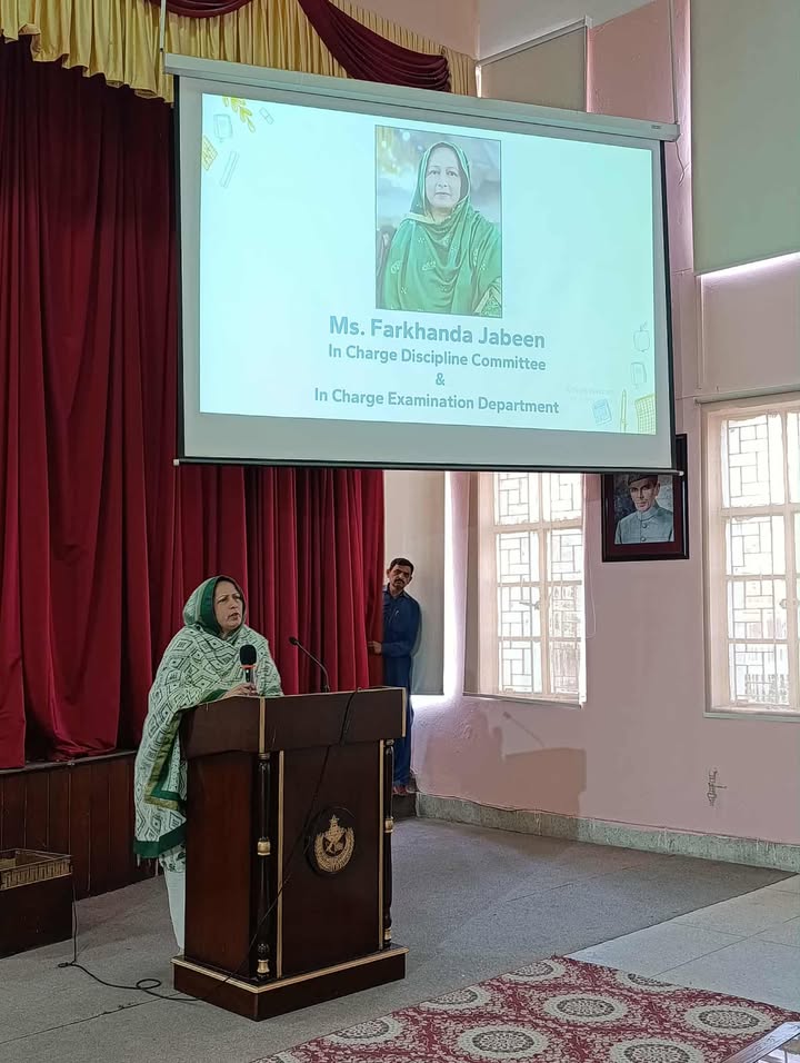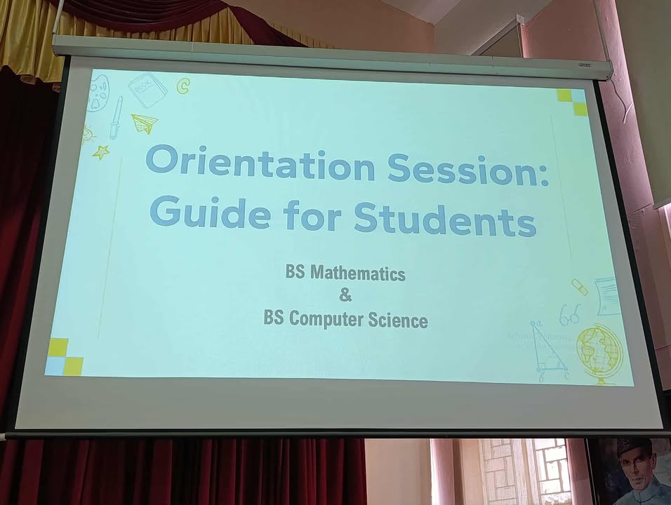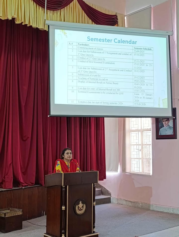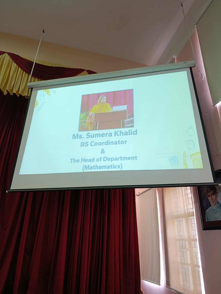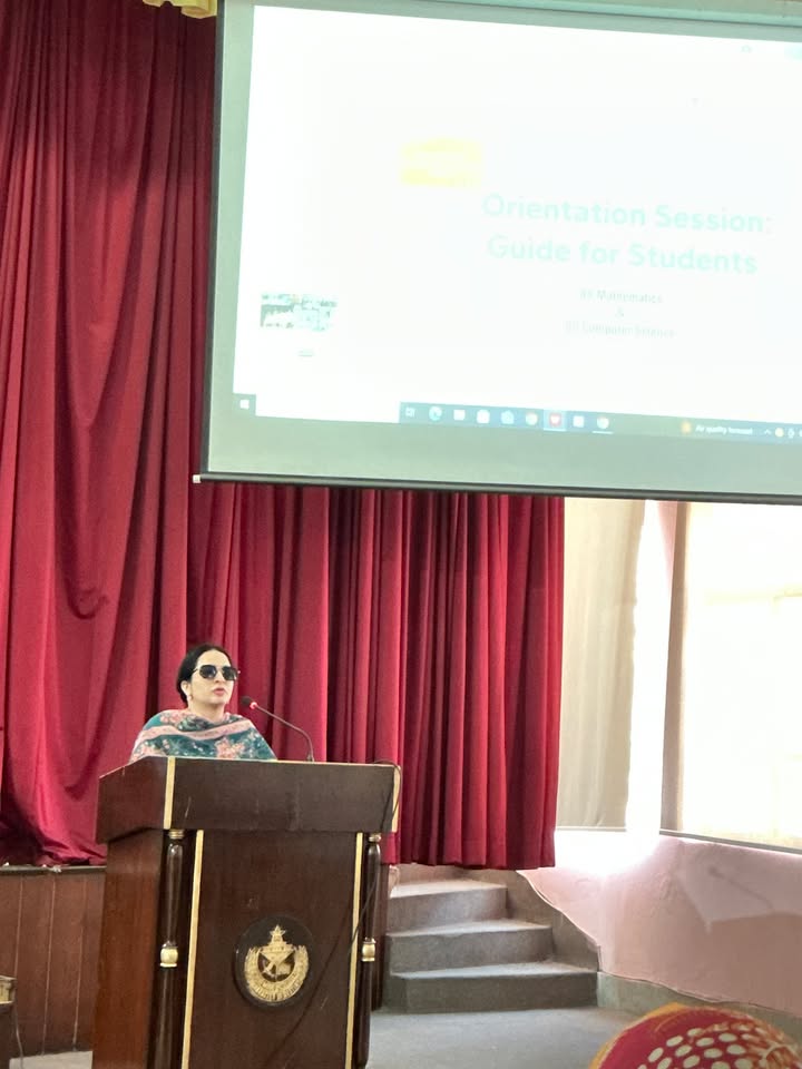 Today’s orientation session for 1st-semester BS Mathematics and BS Computer Science students was held in the college auditorium. The event was honored by the presence of Principal Prof. Aaliya Durrani and Vice Principal Co-Curricular Ms. Asma Maqbool. Our faculty shared important information about college rules, regulations, and the BS program structures. Ms. Farkhanda Jabeen, Discipline and Examination Incharge, explained key policies and exam procedures. Admission Incharge Ms. Noeen Nasir outlined merit criteria and course change protocols. Ms. Shaheena Naz, HOD of Computer Science, presented the grading system, while Ms. Sumera Khalid, HOD of Mathematics and BS Coordinator, provided an in-depth look at the semester plan and related rules. The session concluded with encouraging words from Principal Prof. Aaliya Durrani, followed by the National Anthem.
