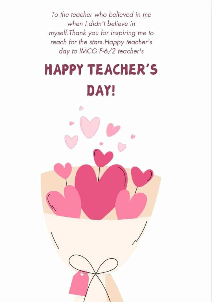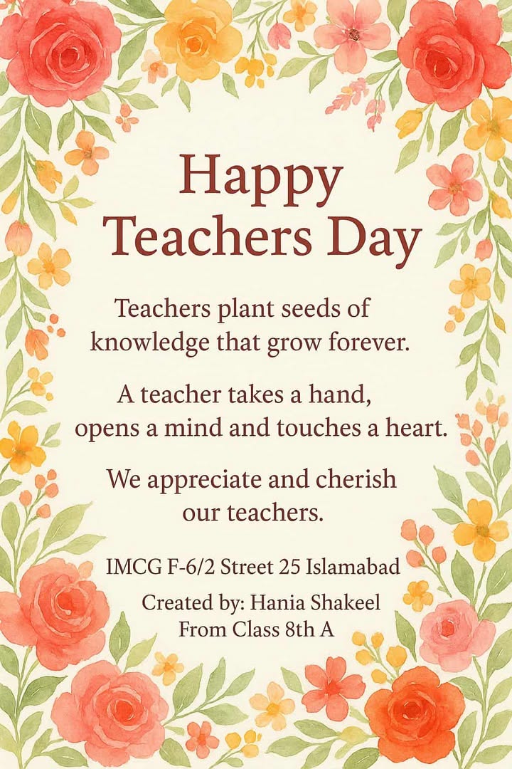 Happy Teachers’ Day! Today, we celebrate the love and gratitude expressed by our hardworking and talented students for their dedicated teachers. These beautiful cards, crafted by our talented 8th A students, reflect their deep appreciation, warmth, and respect. At IMCG, we are more than just an institution— we are a family, connected by bonds of love, care, and respect, much like a garden blooming with diverse flowers nurtured by a thoughtful gardener.