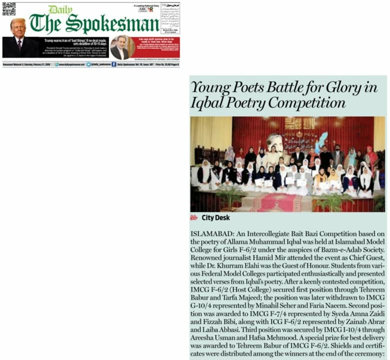 Intercollegiate Bait Bazi Competition coverage On PTV News and in newspapers.