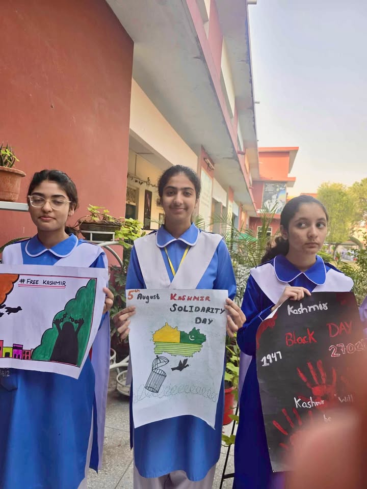 Dua Hanif(10-A) and group in Kashmiri cultural dresses presented a beautiful Kashmiri song. Students also displayed thought-provoking posters reflecting the hardships faced by Kashmiris.