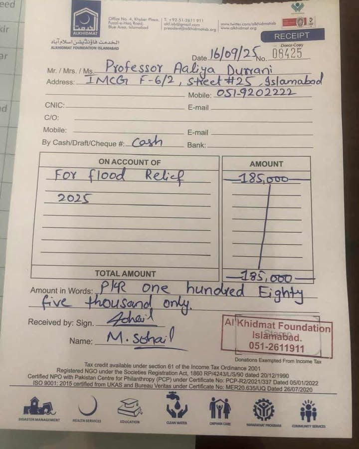 Our Civic Society recently held a donation campaign for the flood victims in Pakistan. A heartfelt thanks to our amazing students from the Morning as well as Evening Shift, Primary Section, and their generous parents for their support! Special appreciation goes to the Incharge of Civic Society, Ms. Tasneem Kausar, and our devoted teachers for leading this effort with compassion and dedication. Together, we made a difference. The donations were handed over to Alkhidmat Foundation by Ms. Tasneem Kausar, Incharge Civic Society, and Ms. Asma Maqbool, VP Co-Curricular, along with our students, to help the affected families. Thank you all for standing with our Pakistani brothers and sisters in need! #CommunitySupport