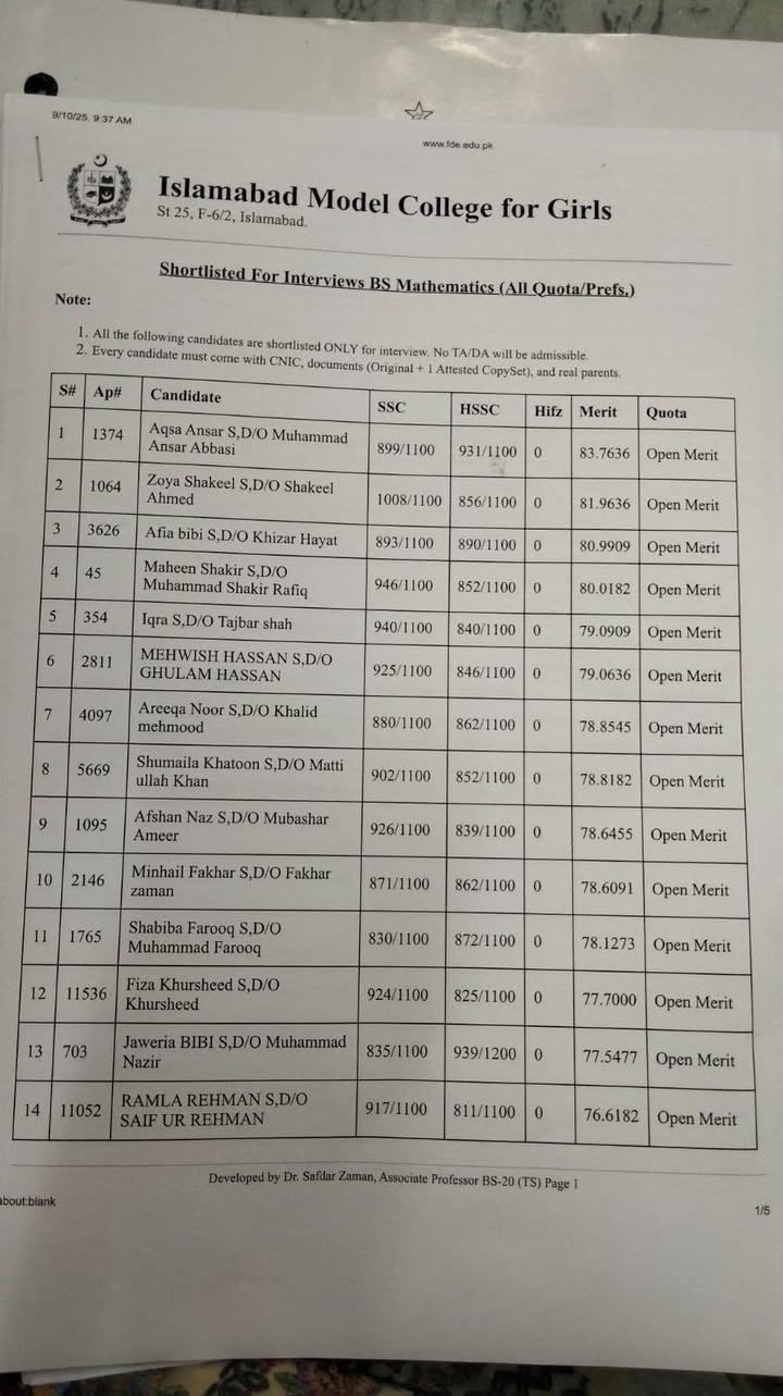 π’ Announcement: Shortlisted Students for BS Mathematics (IMCG F-6/2) INTERVIEW DATE: 11-09-2025 TIMINGS: 8.30am to 12.30pm FIRST MERIT LIST WILL BE DISPLAYED ON : 15-09-2025 βΉβΊ [β¦]