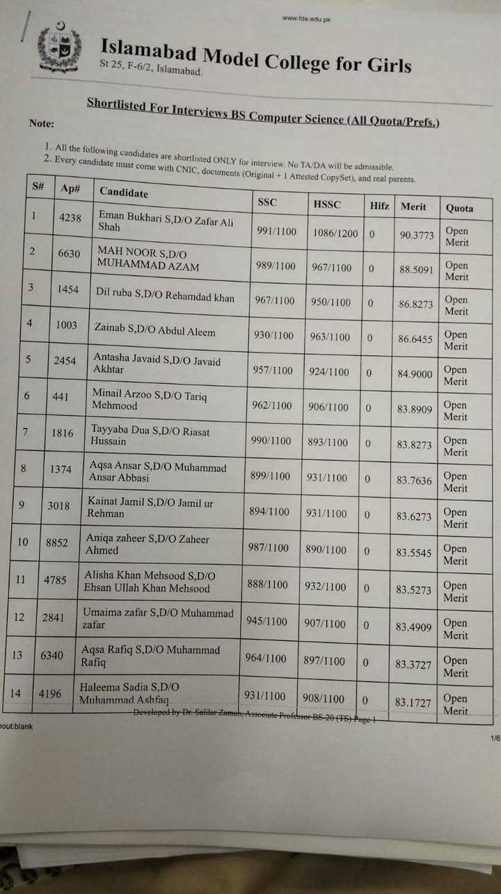 π’ Announcement: Shortlisted Students for BS Computer Science (IMCG F-6/2) INTERVIEW DATE: 11-09-2025 TIMINGS: 8.30am to 12.30pm FIRST MERIT LIST WILL BE DISPLAYED ON : 15-09-2025 [β¦]